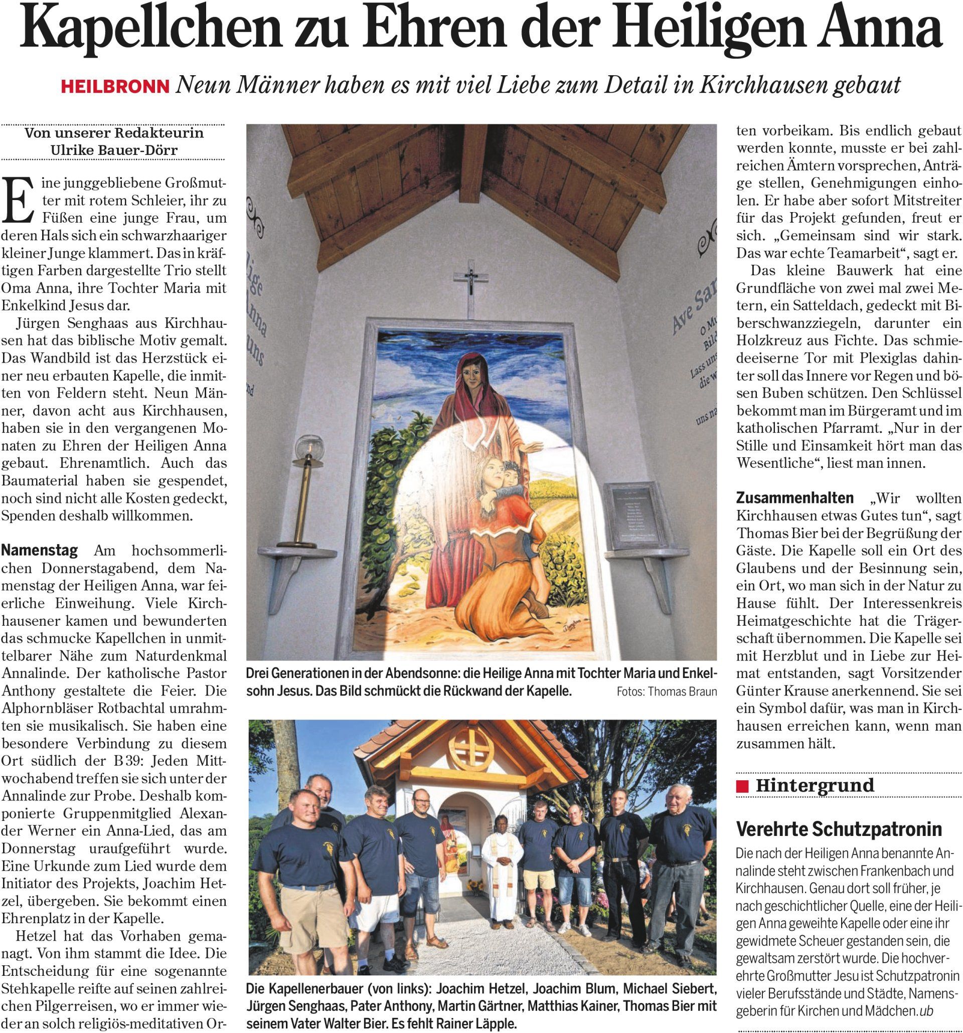 Das Sankt-Anna-Team finanziert, plant, gestaltet und baut eine kleine Kapelle direkt neben der Annalinde in Kirchhausen. Die Einweihung ist nach jahrelanger Vorbereitung am Gedenktag der heiligen Anna am 26. Juli 2012: "Jürgen Senghaas ist Teil des Teams und malt das Wandbild in wochenlanger Arbeit mit Acrylfarben auf eine Fermacell-Platte. Die Beschriftungen auf den Innenwänden links und rechts werden von ihm mit Fassadenfarbe und Pinsel direkt auf den Putz übertragen." Überrascht reagieren manche Besucher, warum Jesus als Junge dargestellt ist. Dazu der Maler: "Entweder man kennt Jesus als Säugling oder wenn er tot am Kreuz hängt. Ich wollte zeigen, dass er ein ganz normales Kind war, der seine Mutter und seine Oma geliebt hat."
